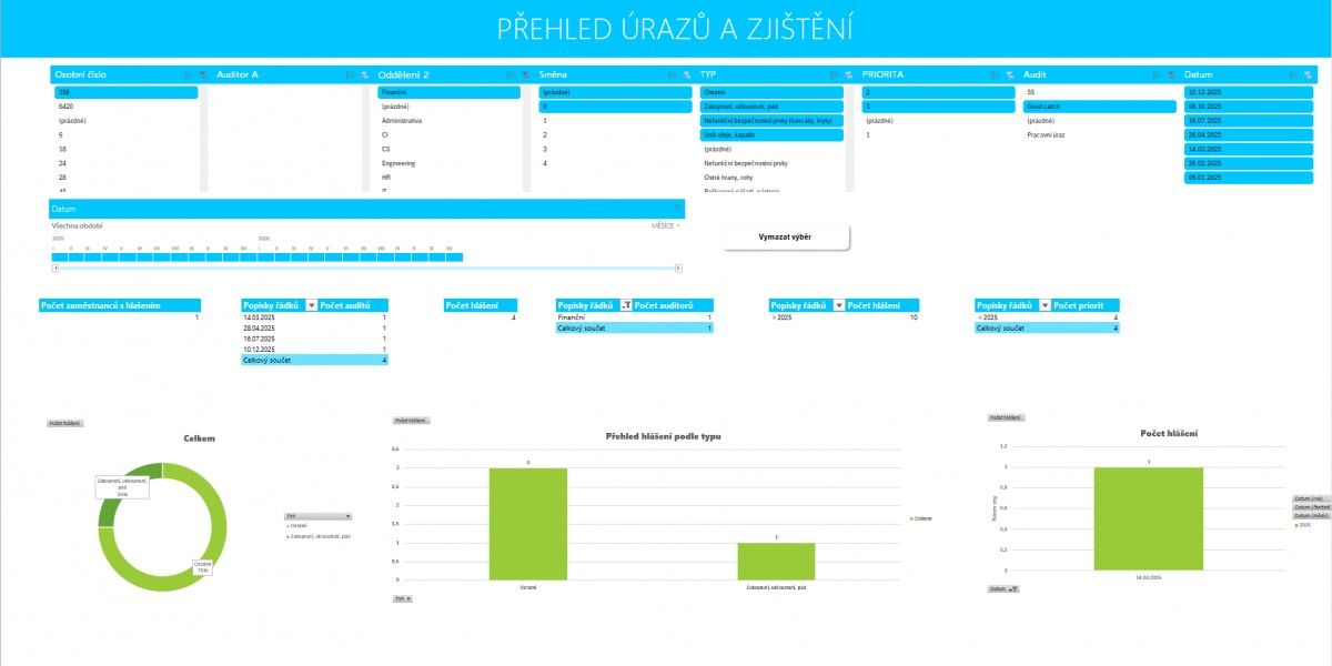 Analytický dashboard BOZP zobrazující úrazy, audity a jejich kategorizaci