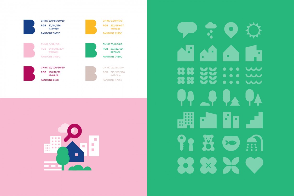 Hlavním prvkem vizuálu je písmo Lexend a sada minimalistických ikon, které zachycují témata sociálního bydlení a související problematiky.