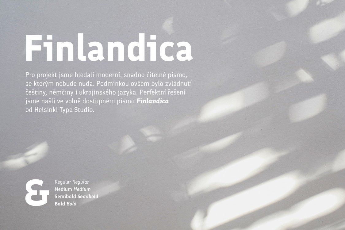 Pro projekt jsme hledali moderní, snadno čitelné písmo, se kterým nebude nuda. Podmínkou ovšem bylo zvládnutí češtiny, němčiny i ukrajinského jazyka. Perfektní řešení jsme našli ve volně dostupném písmu Finlandica.