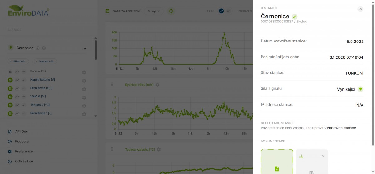 Aplikace umožňuje realtime monitoring stanic s možností editace informací a přidávání dokumentů