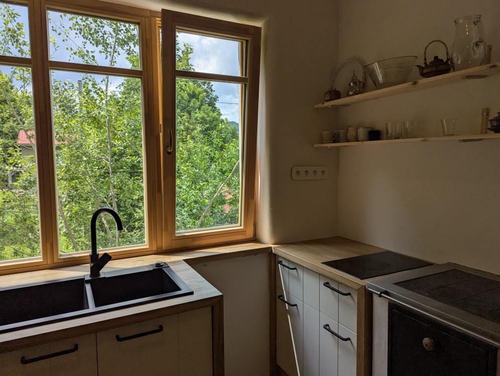 Kuchyně plynule navazuje na okno a na kamna na dřevo.