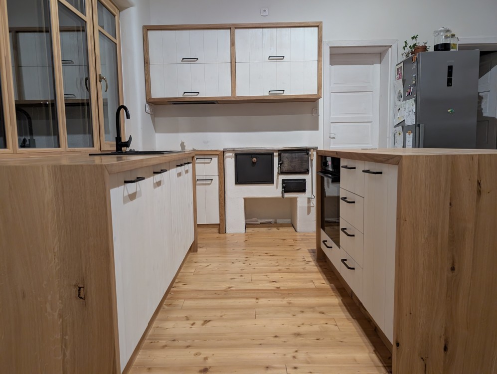 Kombinace tmavé masivní pracovní desky z dubového dřeva a bíle lakovaných smrkových dvířek vytváří elegantní kombinaci.