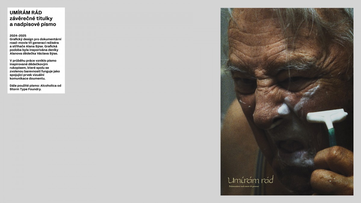 PředchozíNávrh šablony moodboardu pro video dokumentace ateliéru SchwesterGrafický design pro dokumentární road movie tří generací režiséra a střihače Alana SyčeUMÍRÁM RÁD závěrečné titulky a nadpisové písmoBannery AlunadHow Was Your Day? – koncept, grafický design, fotografieDalší