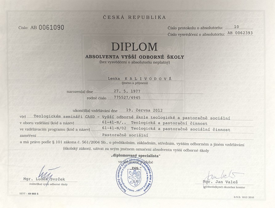 Diplom absolventa Vyšší odborné školyDiplom Bachelor of ArtsOsvědčení personalistikaPotvrzení z kurzu PersonalistikaDalší