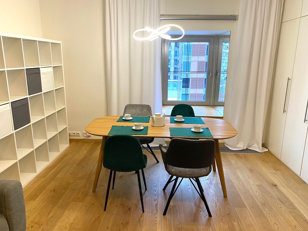 Denní zóna s obývacím pokojem, jídelním stolem a dělící příčkou
