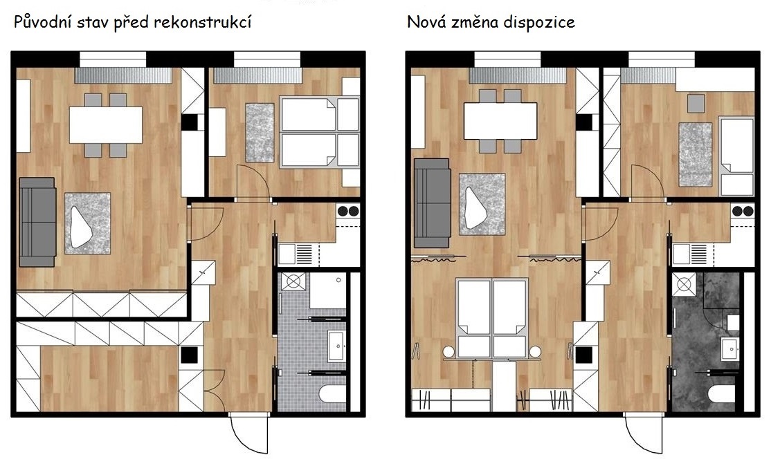 Návrh změny dispozice s obývacím pokojem a dělící posuvnou příčkou