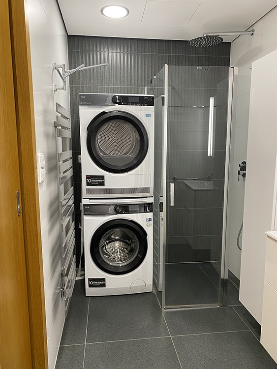 Koupelna s pračkou, sušičkou a umyvadlovou skříňkou