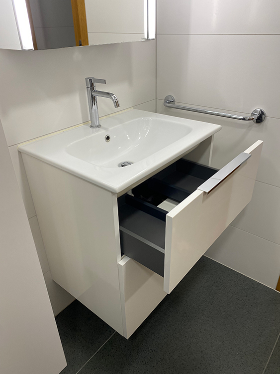 Detail umyvadla se skříňkou a zrcadlovou stěnou