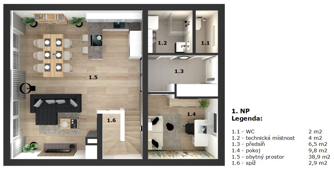 Půdorys 1. nadzemního podlaží s popisem dispozice
