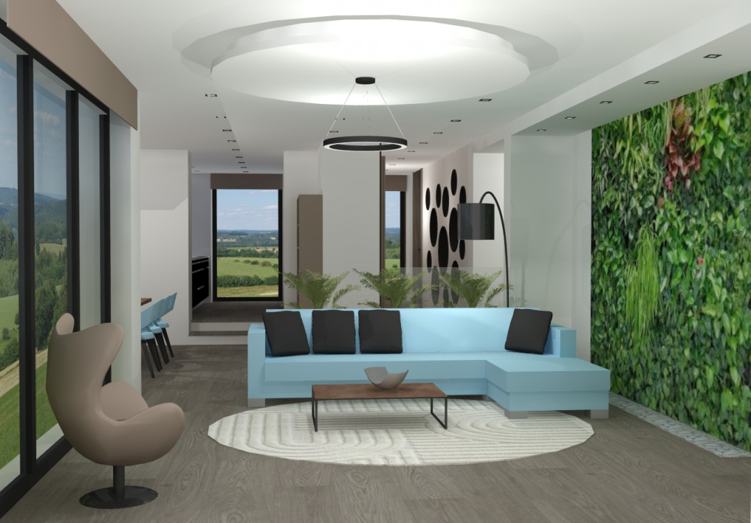 Obývací pokoj s velkými okny a přímým propojením do exteriéru