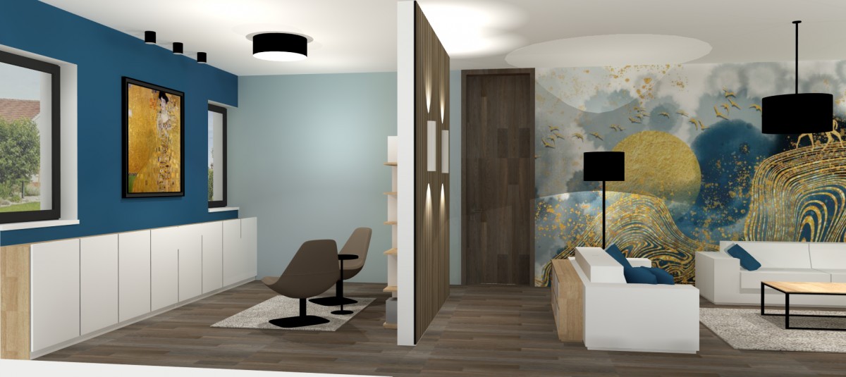 PředchozíPrůhled interiérem s důrazem na čisté linie a funkční uspořádáníDenní zóna s kuchyní, jídelnou a navazujícím obytným prostoremPohled do hlavního obytného prostoru s barevným akcentemPůdorys rodinného domu s vyznačením hlavní dispozicePokoj slečny s pracovním koutem a barevnými akcentyDalší