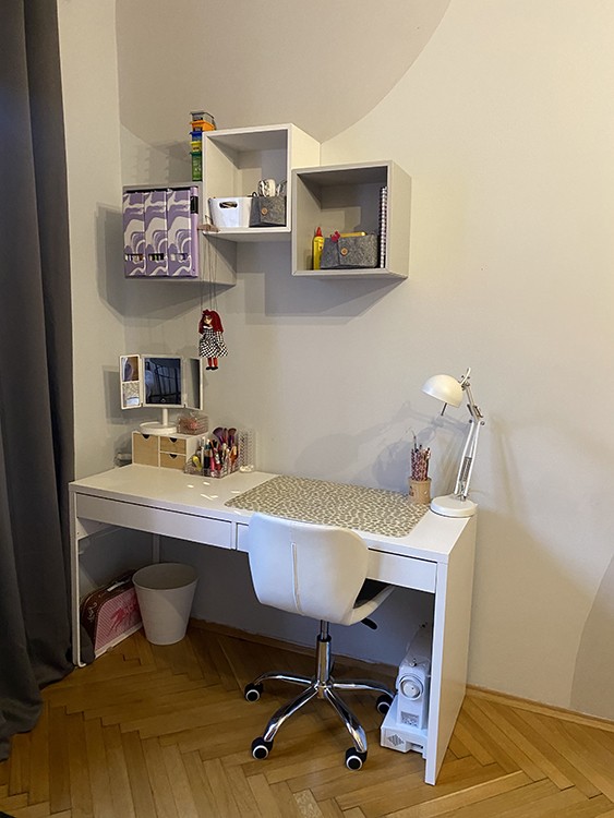 PředchozíPůdorys rodinného domu s vyznačením hlavní dispozicePokoj slečny s pracovním koutem a barevnými akcentyPracovní místo v pokoji slečny s policemi a úložným řešenímPohled do pokoje slečny se vstupem a pracovní částíÚložná sestava v pokoji slečny s navazujícím pracovním koutemDalší