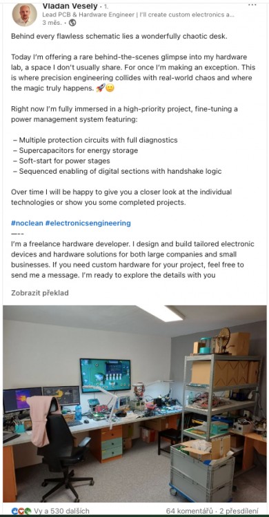 LinkedIn příspěvek na profil HW developera Vladana Veselého