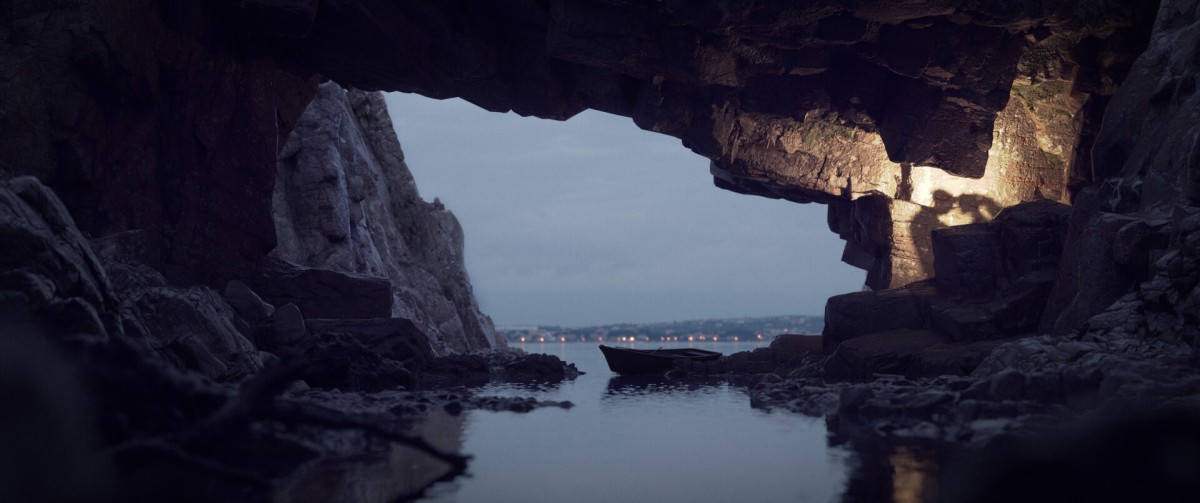 Atmosférická 3D scéna jeskyně s výhledem na vodní hladinu