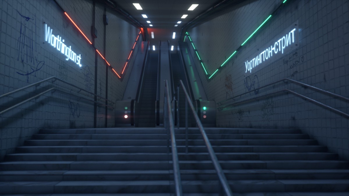 Neonově nasvícený vstup do metra v temné futuristické atmosféře