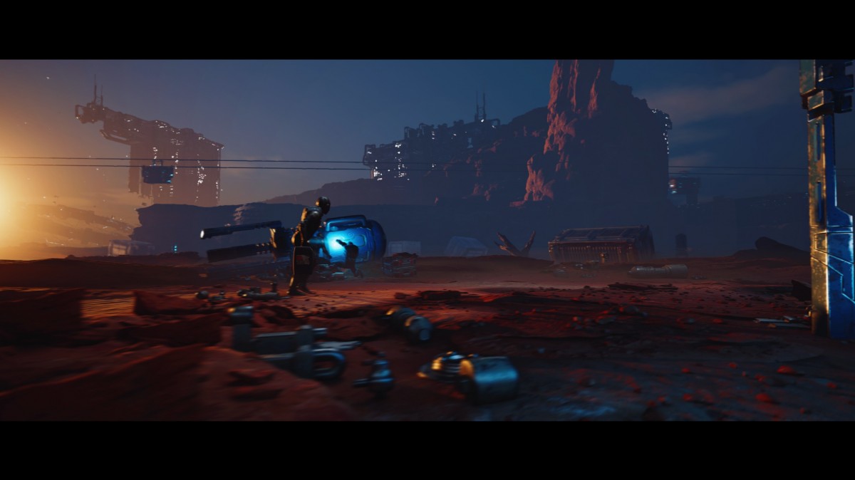 Filmová sci-fi scéna z rudé planety s postavou a futuristickou základnou