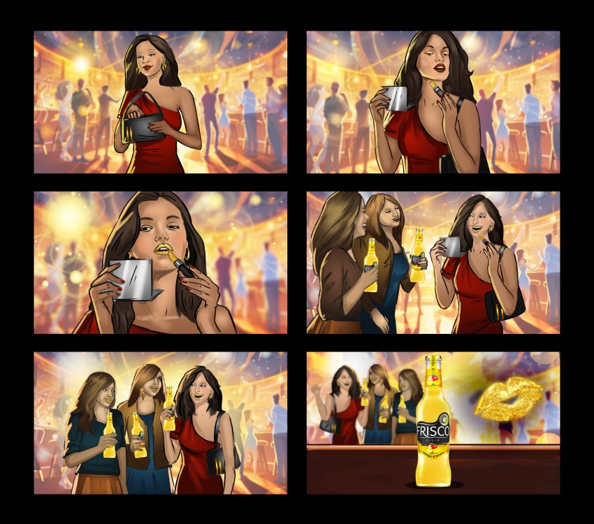 Ilustrace storyboardu pro reklamní spot Frisco koncept 01