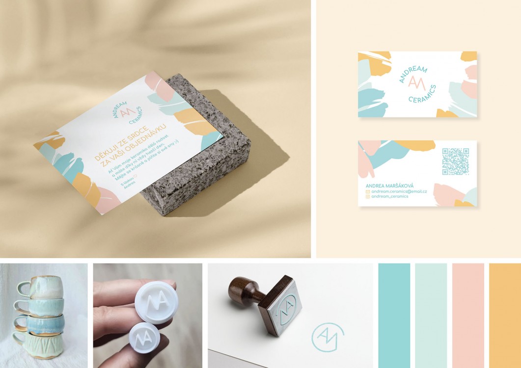 Loga jsem vytvořila dle představy a skic keramičky. Navrhla jsem jí základ brandu (barvy, písmo, Brand Book) a kreativní grafický styl (odkazující k tahům štětce, když malujete glazurou), který můžete vidět na vizitkách. A tvořila jsem i děkovné kartičky.