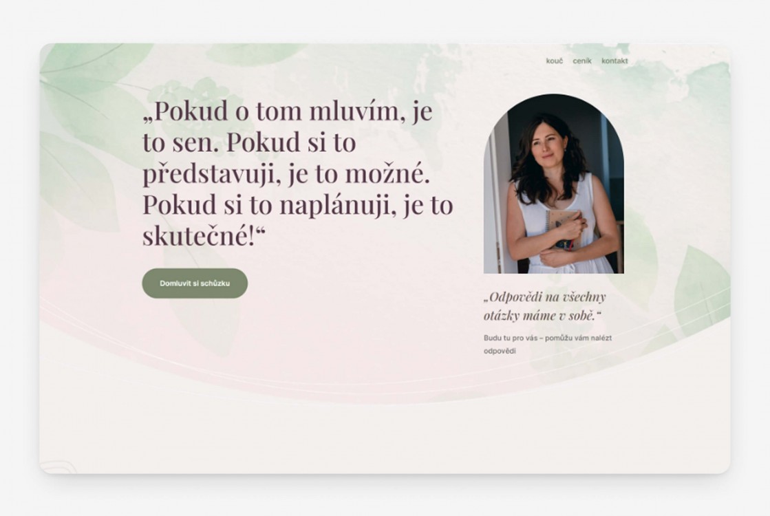 Jemný web pro koučku s citátem, portrétem a tlačítkem pro domluvu schůzky