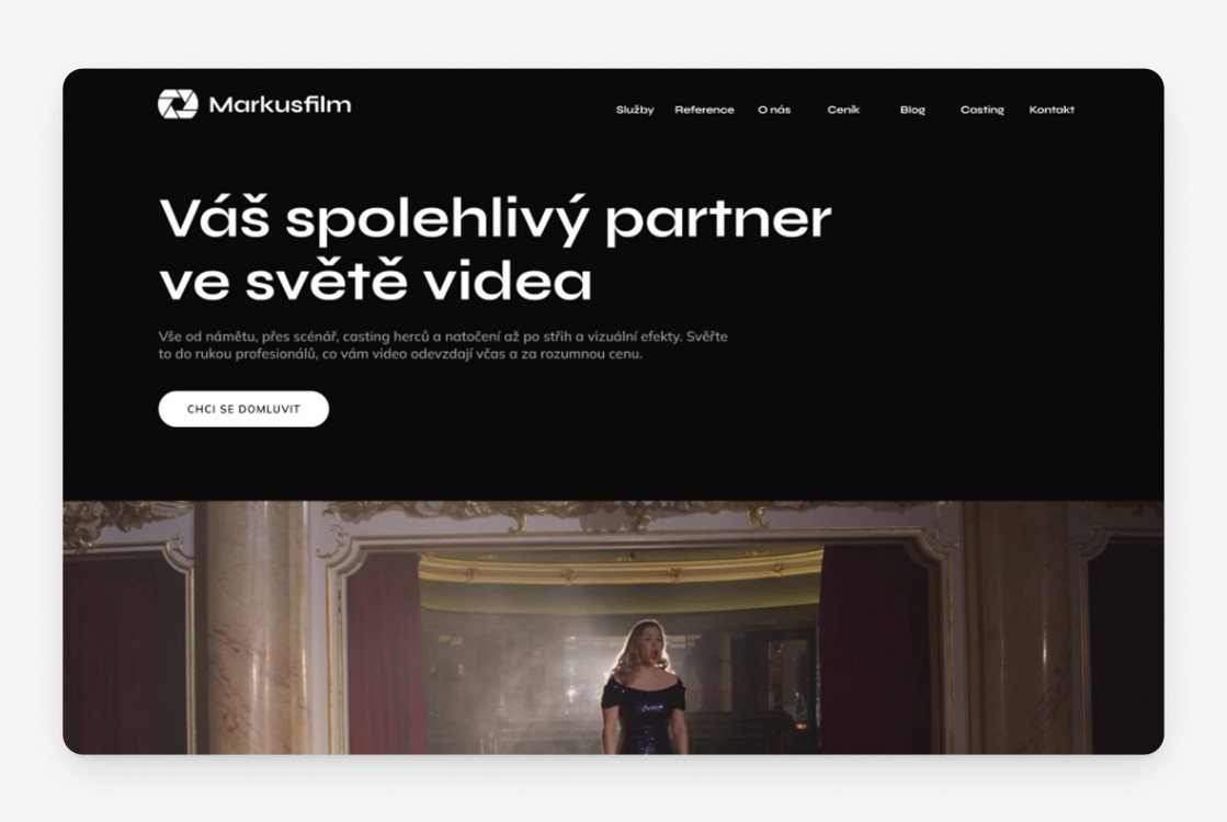 Web filmové produkce Markusfilm s výrazným claimem a ukázkou videa