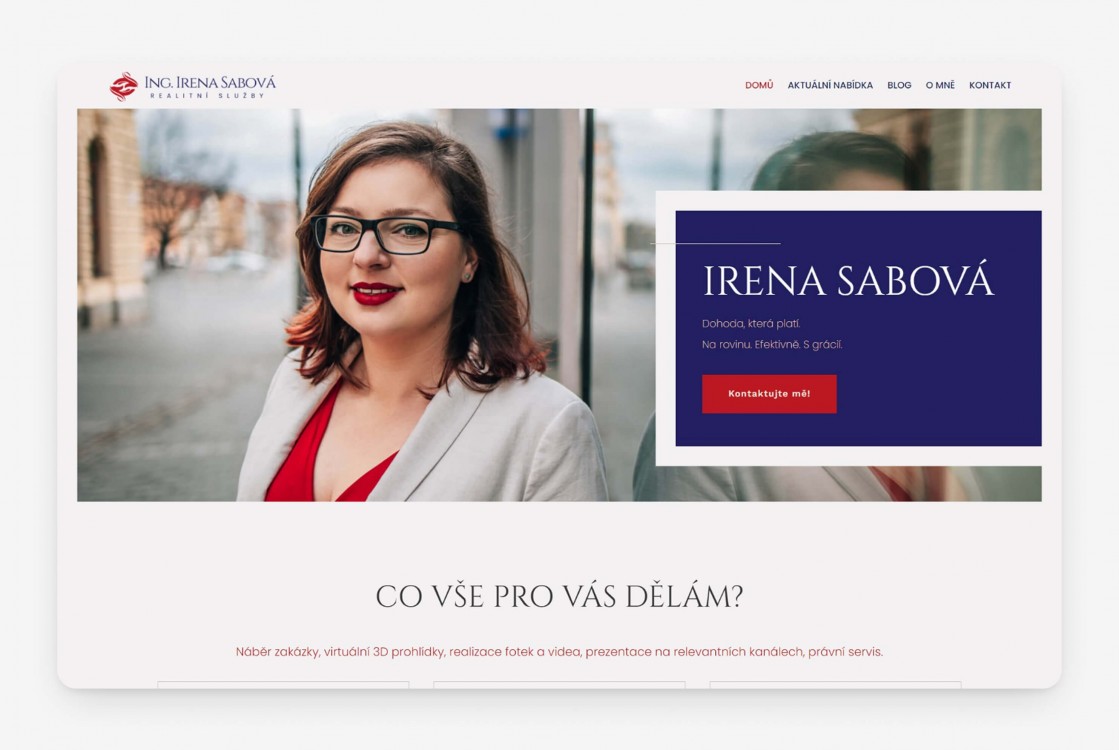 Osobní web realitní makléřky Ireny Sabové s výrazným portrétem a výzvou ke kontaktu