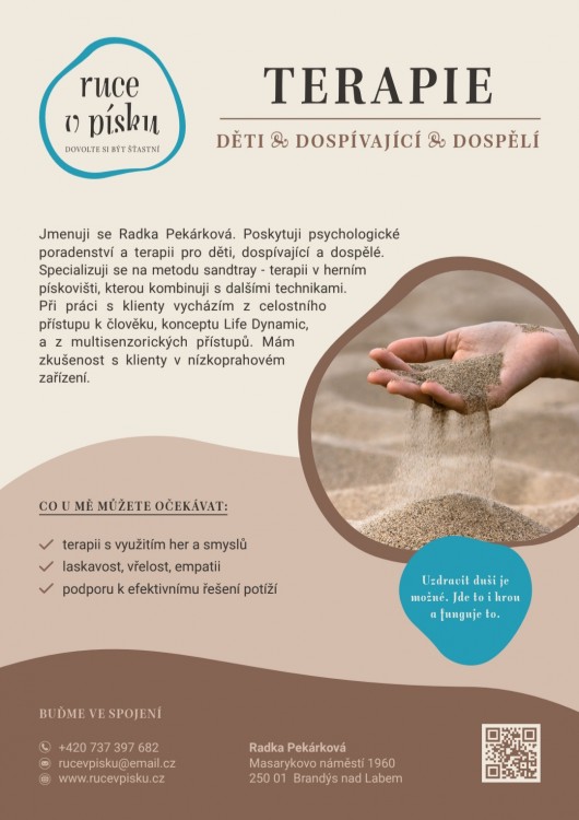 Radka Pekárkovápsychoterapeutka, terapeutka a průvodkyně v náročných životních situacích — Individuální terapie pro děti, dospívající i dospělé s využitím sandtray techniky, terapeutických karet a dalších metod zaměřených na vnitřní stabilitu, práci s emocemi a obnovu psychické rovnováhy. Bezpečný a respektující přístup.