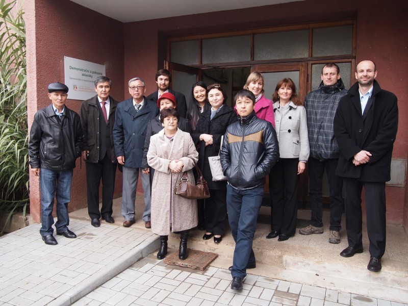 Skupinové foto před budovou během zahraniční pracovní návštěvy